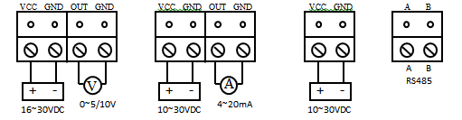 根據選型不同,其接線方式會不同,下圖分別為電壓輸出、電流輸出、RS485輸出接線方式: